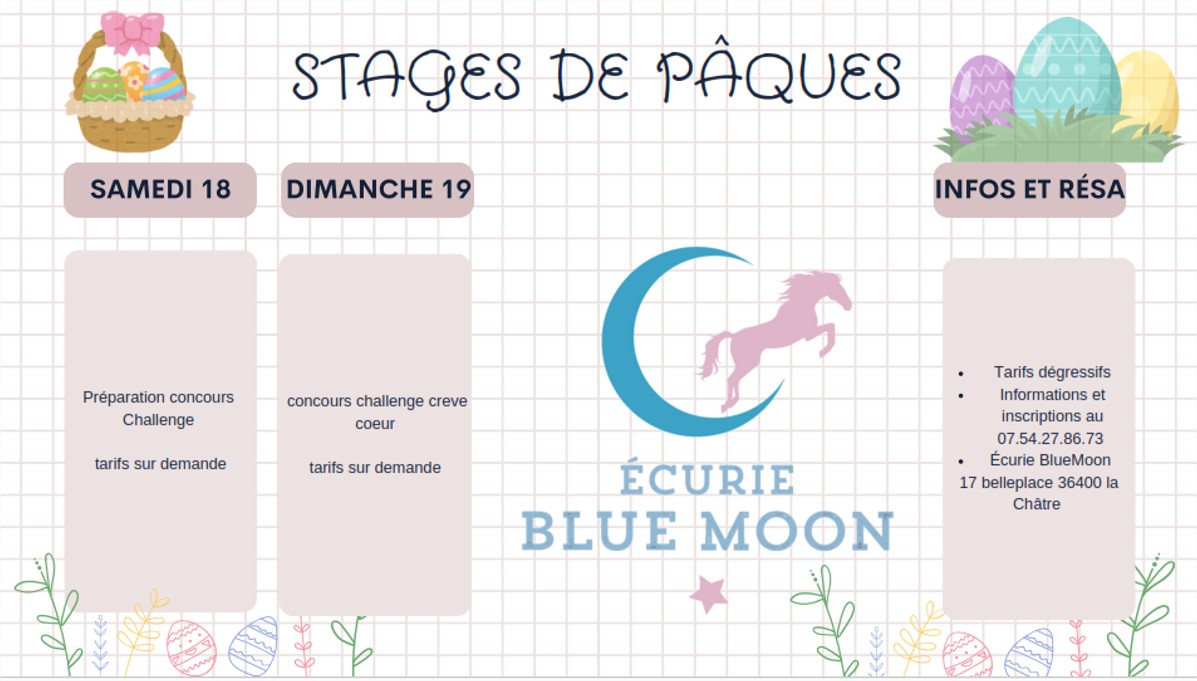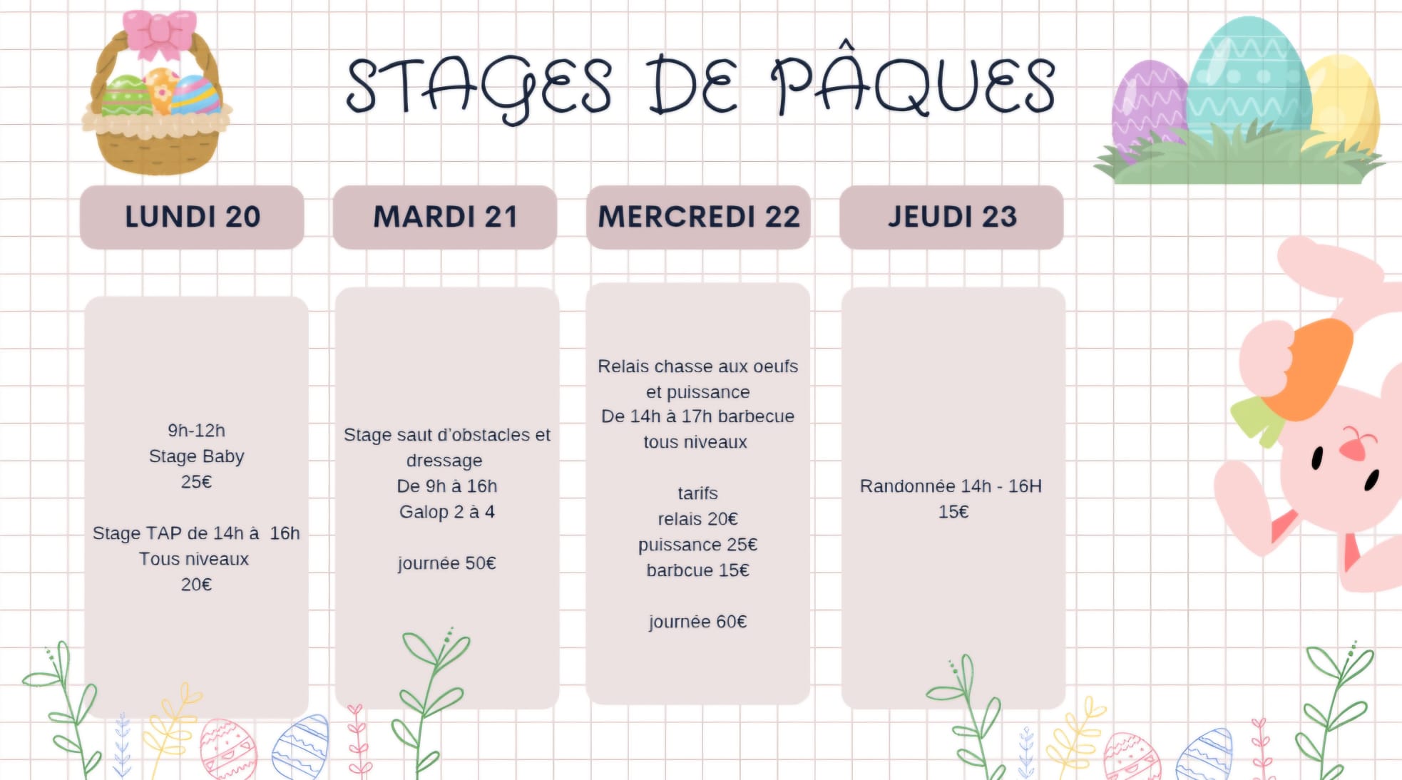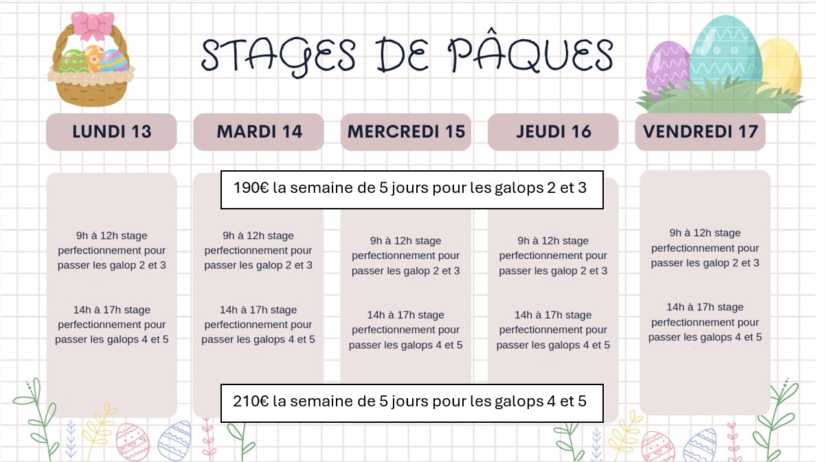 Stage de Pâques 2026: Renseignements et tarifs par email ou par téléphone au 06.54.27.86.73